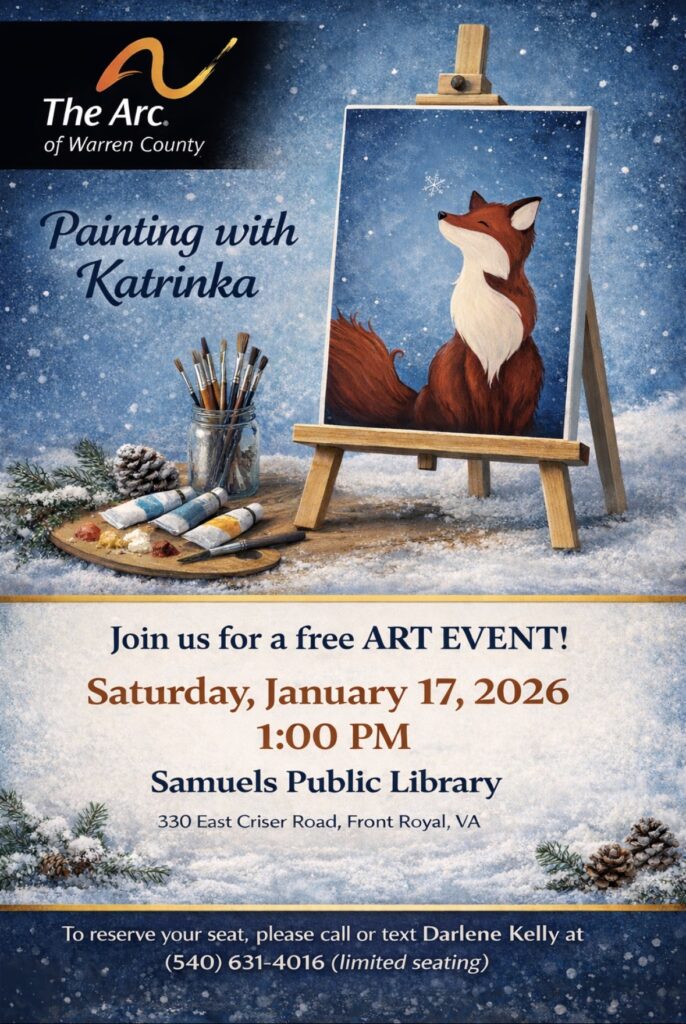 Everyone is welcome to come paint with Katrinka. This is a free inclusive event. Due to limited class size, registration is required. To register, call/text Darlene at 540.631.4016.